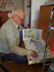 I Hasses ”skrivar- och tecknarstuga” ligger travar med akvareller och andra konstverk. I bokhyllorna står många av hans böcker med egna texter och illustrationer.
