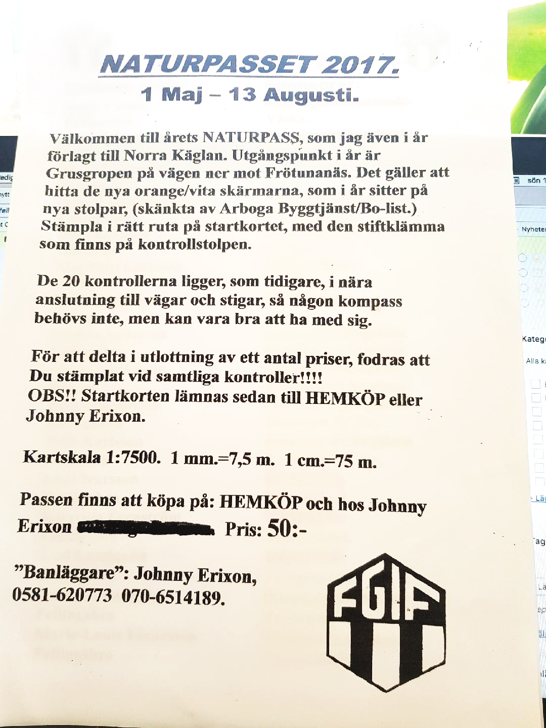 Naturpasset genomfördes även i år vid Norra Käglan. 20 kontroller skulle man hitta och stämpla in på startkortet från FGIF. Johnny Erixon var banläggare.