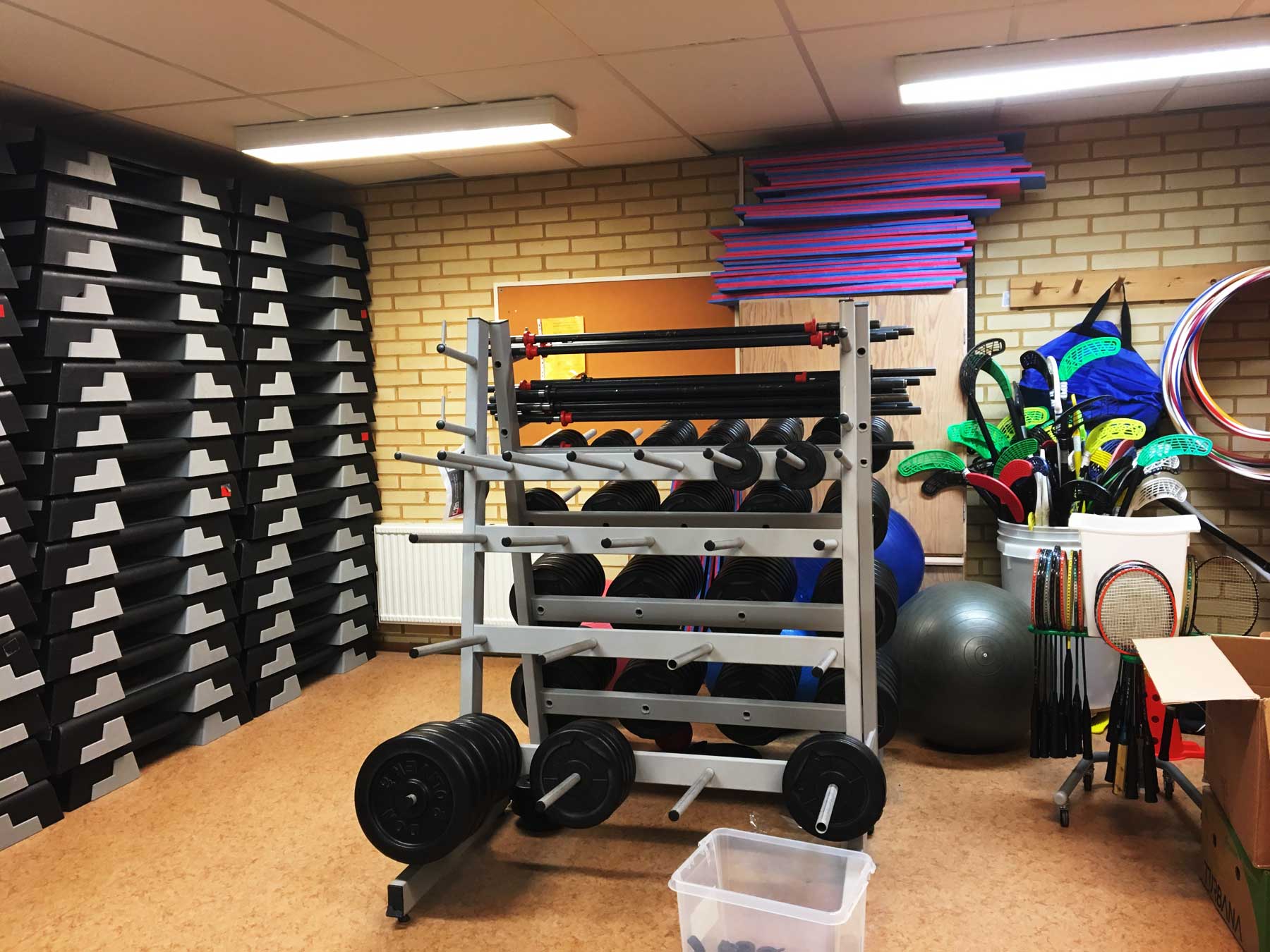 I idrottshallen finns det gott om utrustning att välja bland.