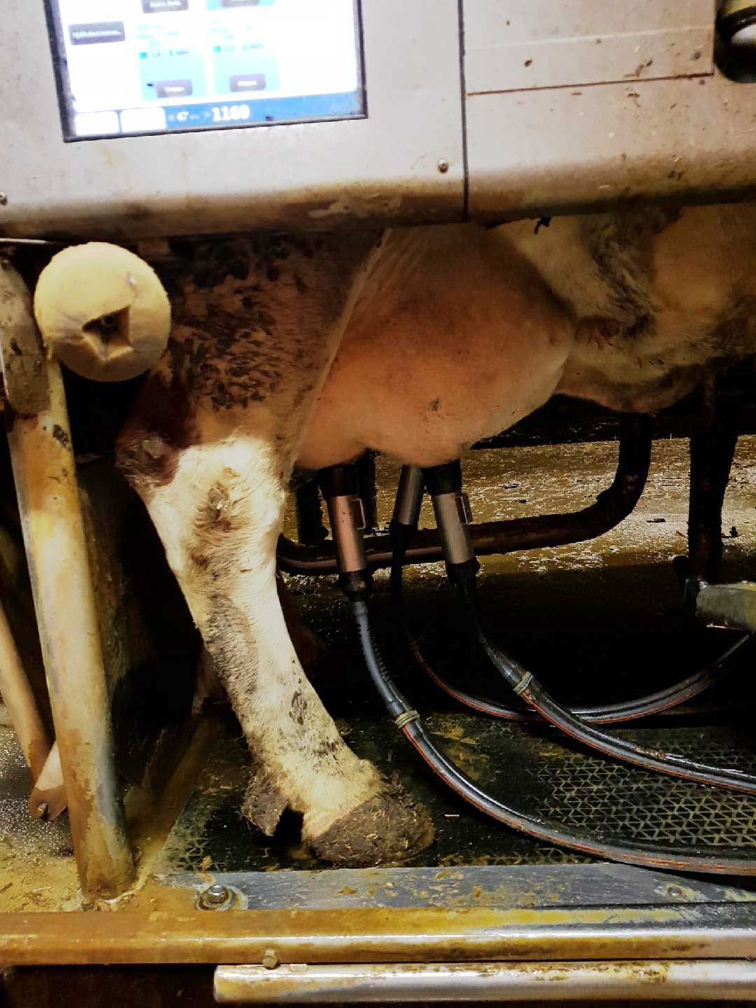 Förklaringen till det är mjölkroboten. Den har dygnet runt öppet för Blomma och hennes 69 kokompisar. När de känner att det rinner till går de helt enkelt in i ett bås och låter roboten lätta på trycket.
