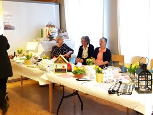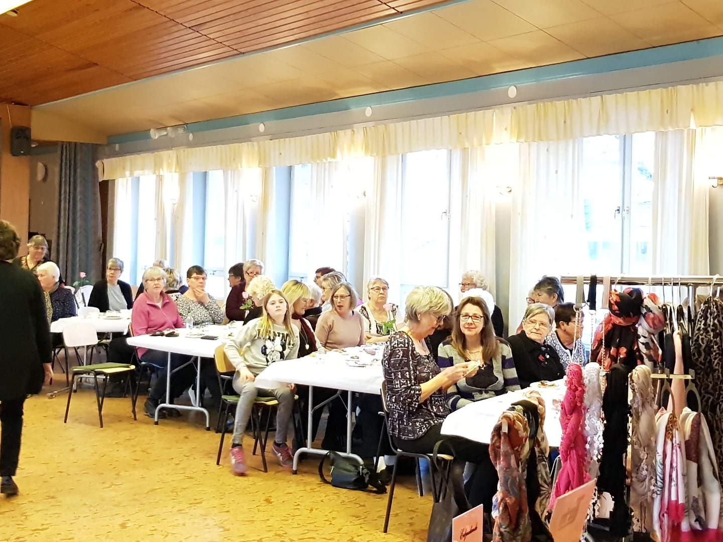 Kyrkans välkomstkommitté, Susanne Persson, Britt Östman och Maggan Persson, tog varmt hand om gästerna. Samtliga bord var fyllda av glada kvinnor som med stor förväntan såg fram emot modevisningen. Det var över hundra besökande.