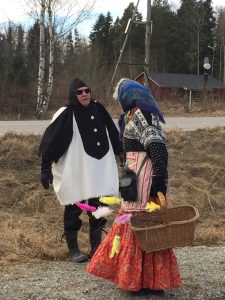 – Vi försöker också variera manus lite för varje år. Vi har haft bokstavsjakt för att hitta rätt påskfigur, ett år hade påskkärringen störtat p.g.a kvasthaveri och tappat allt sitt påskpynt och i år började spelet inne i Ullergården med att både skatan och tuppfamiljen hade irrat bort sig så påskkäringen fick komma in och skicka iväg dem bortåt vägen mot skogen. Påskkärringen upptäckte också att hennes kvast var stulen så hon och barnen beslöt att gå iväg bortåt skogen för att leta efter både kvast och ägg.
