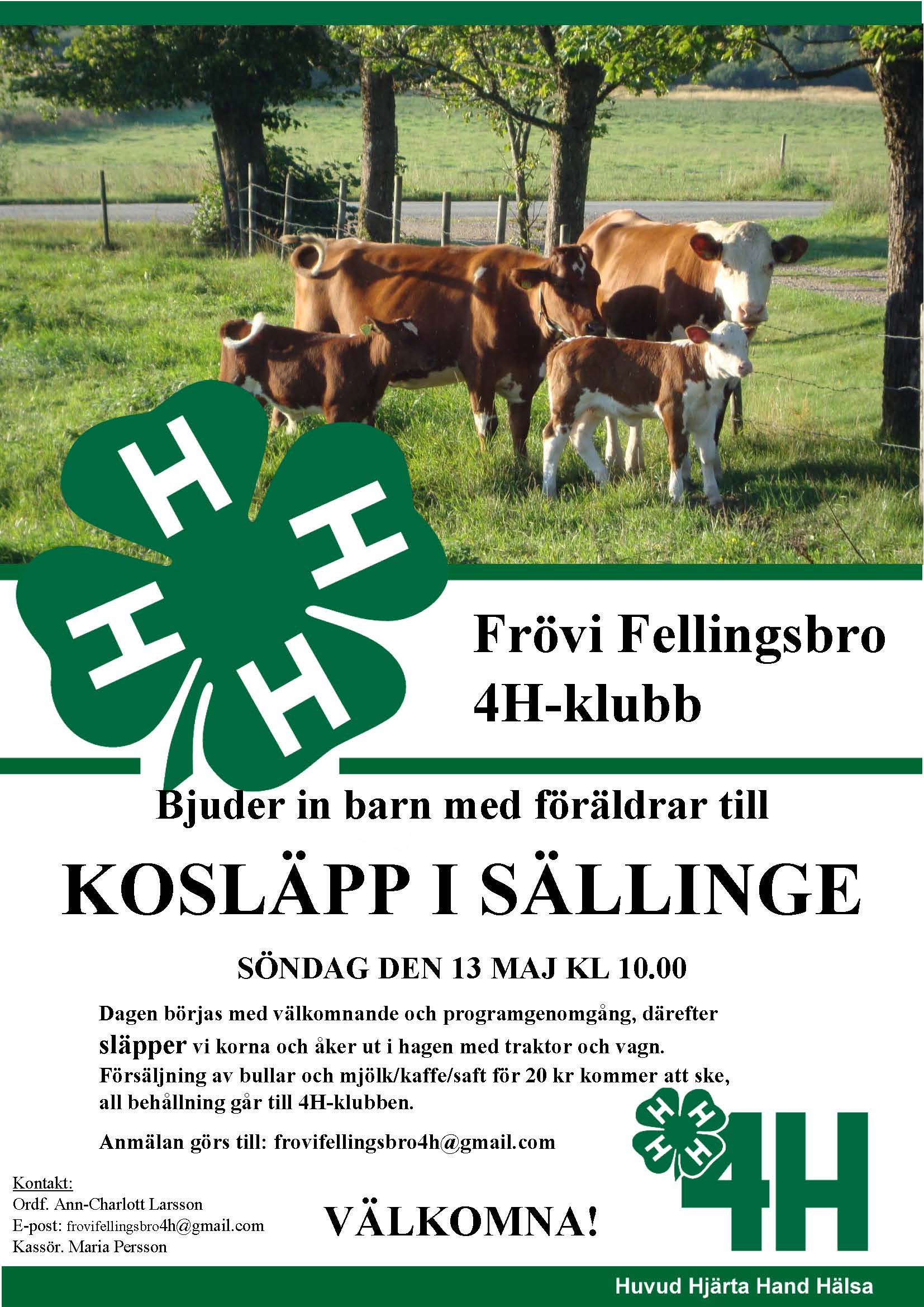 Premiärarrangemanget för Fellingsbro/Frövi 4H-klubb blir att ordna ett kosläpp i Sällinge den 13 maj för förskolebarn och skolbarn (med föräldrar) från Fellingsbro, Rockhammar, Pilkrog och Frövi.