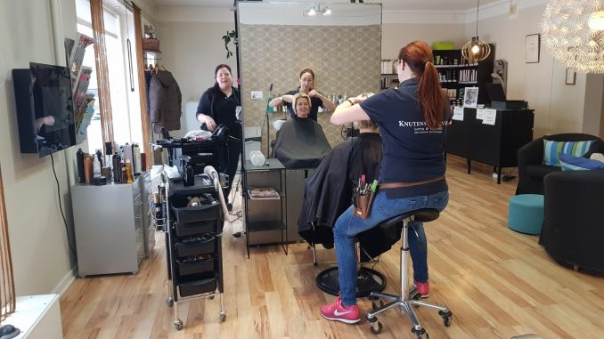 Lotties som drivit Knutens Hårvård i 19 år träffade Viktoria med jämna mellanrum på olika frisörkurser. Tycke uppstod. Nu är de ett par yrkesmässigt och delar såväl salong samt skratt. Det syns och hörs att de trivs med varandra.