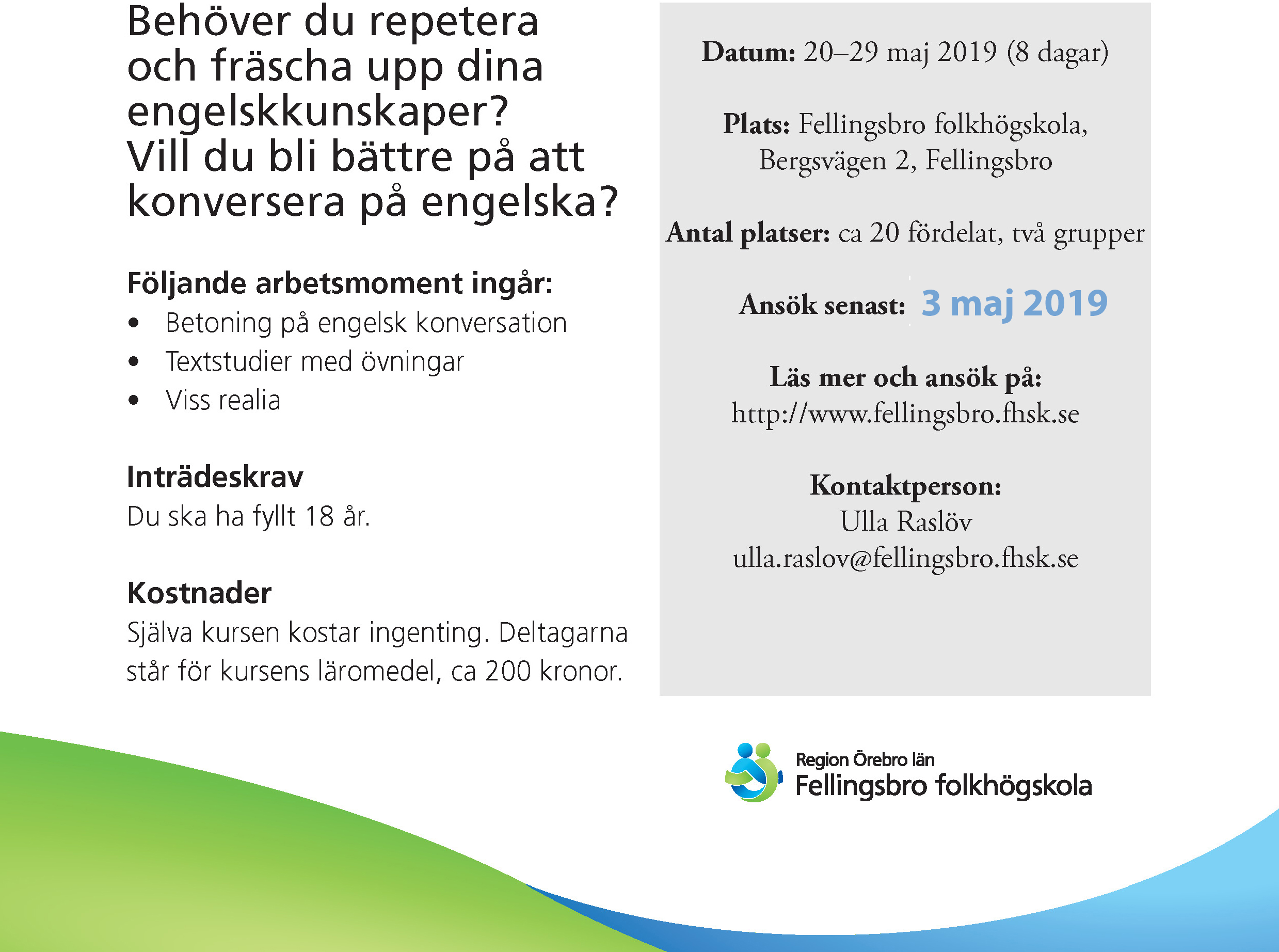 Intensivkurs på Fellingsbro folkhögskola i engelska 20-29 maj 26 april, 2019 Elias ben Salem Nyheter Kommentarer inaktiverade för Intensivkurs på Fellingsbro folkhögskola i engelska 20-29 maj