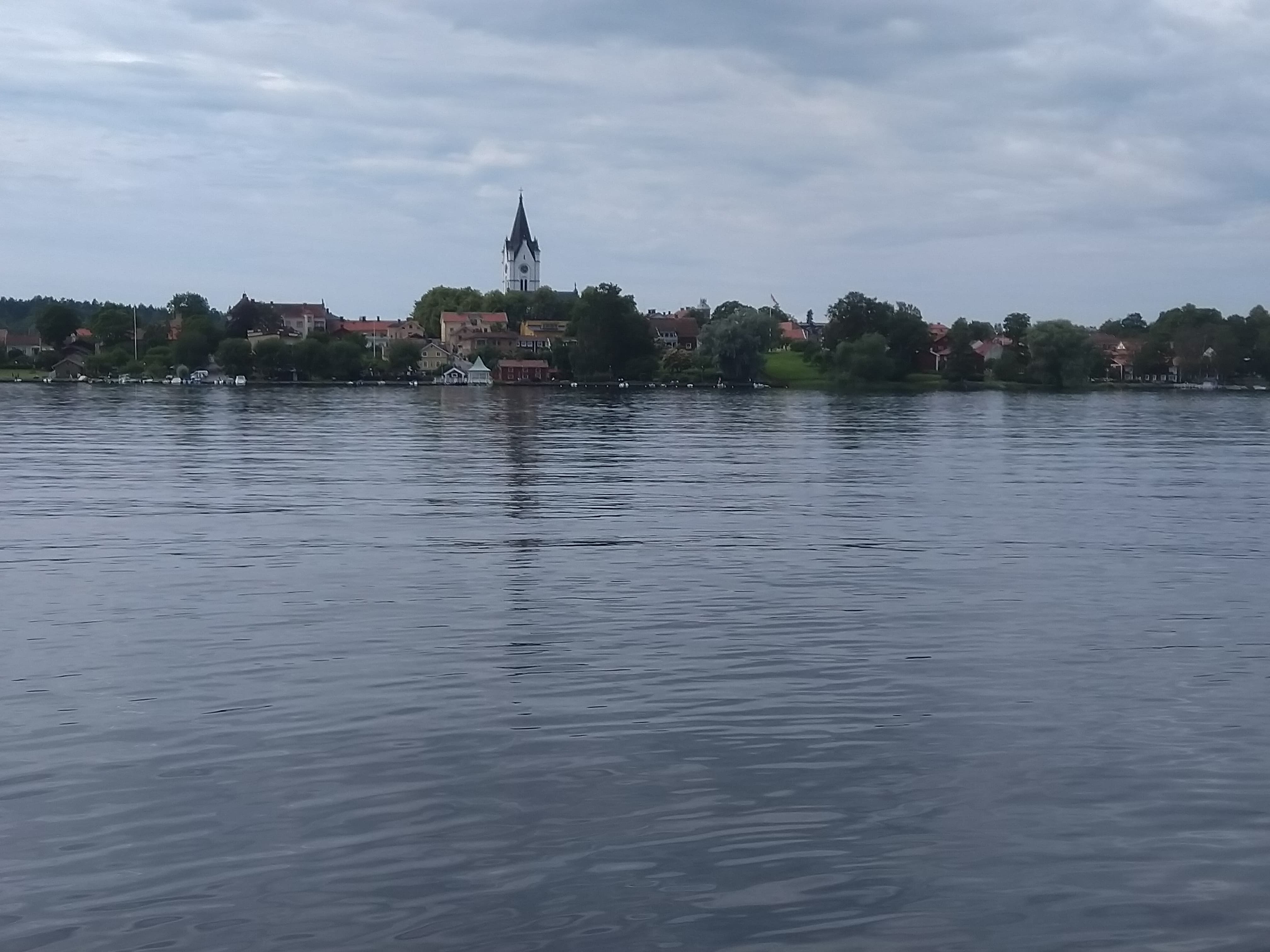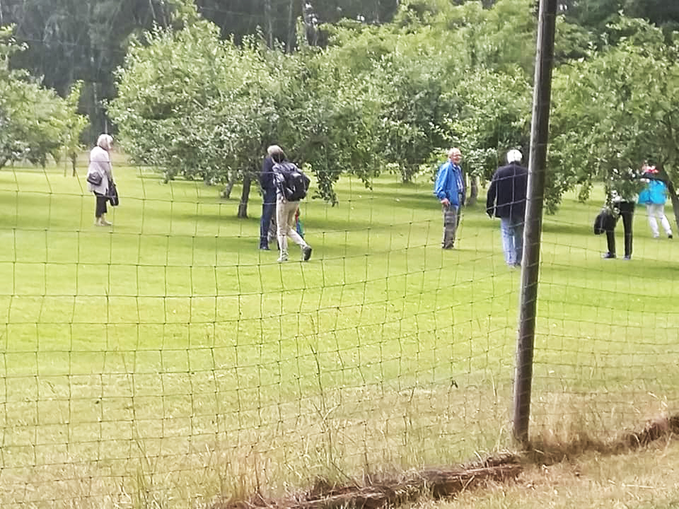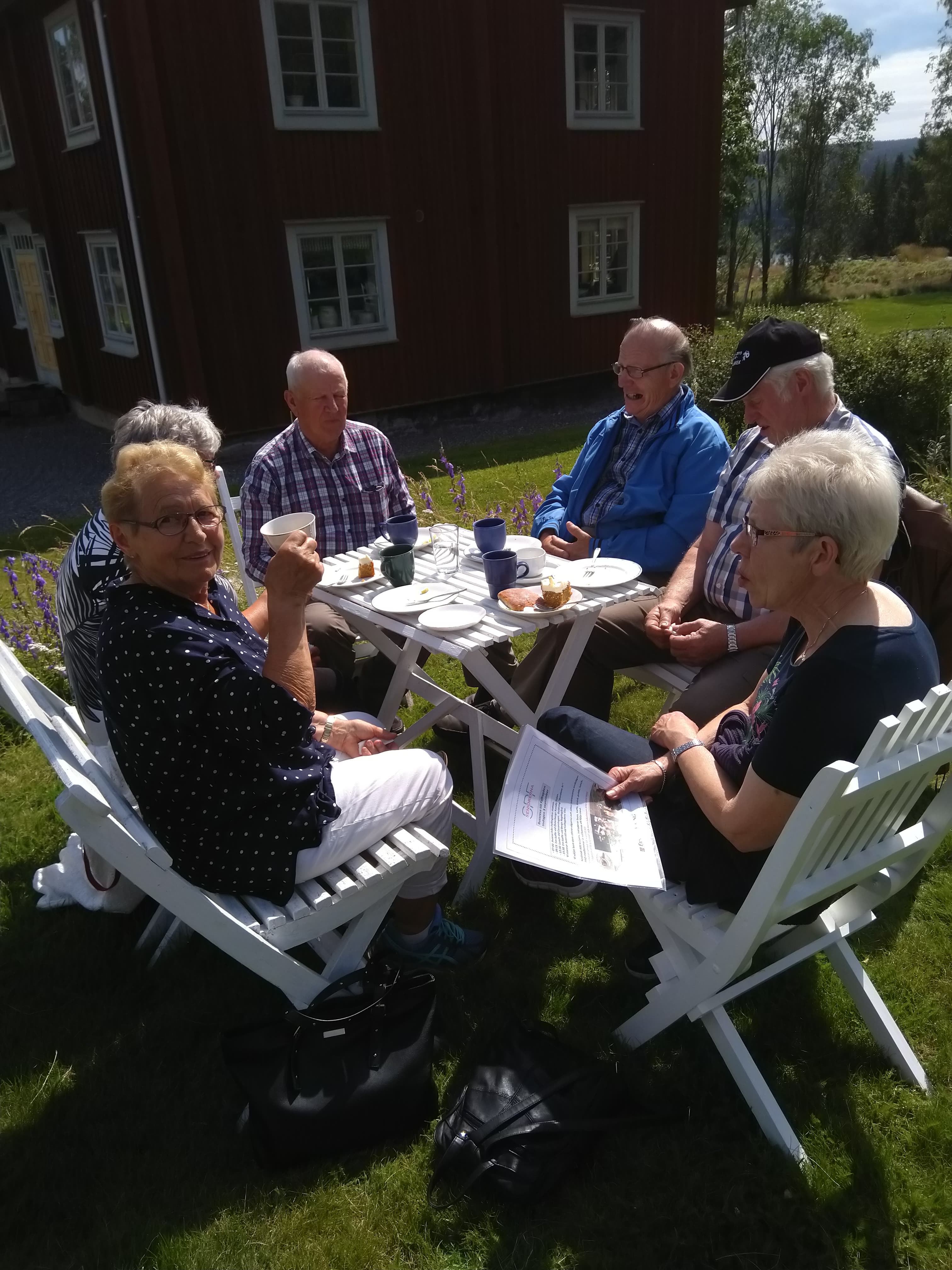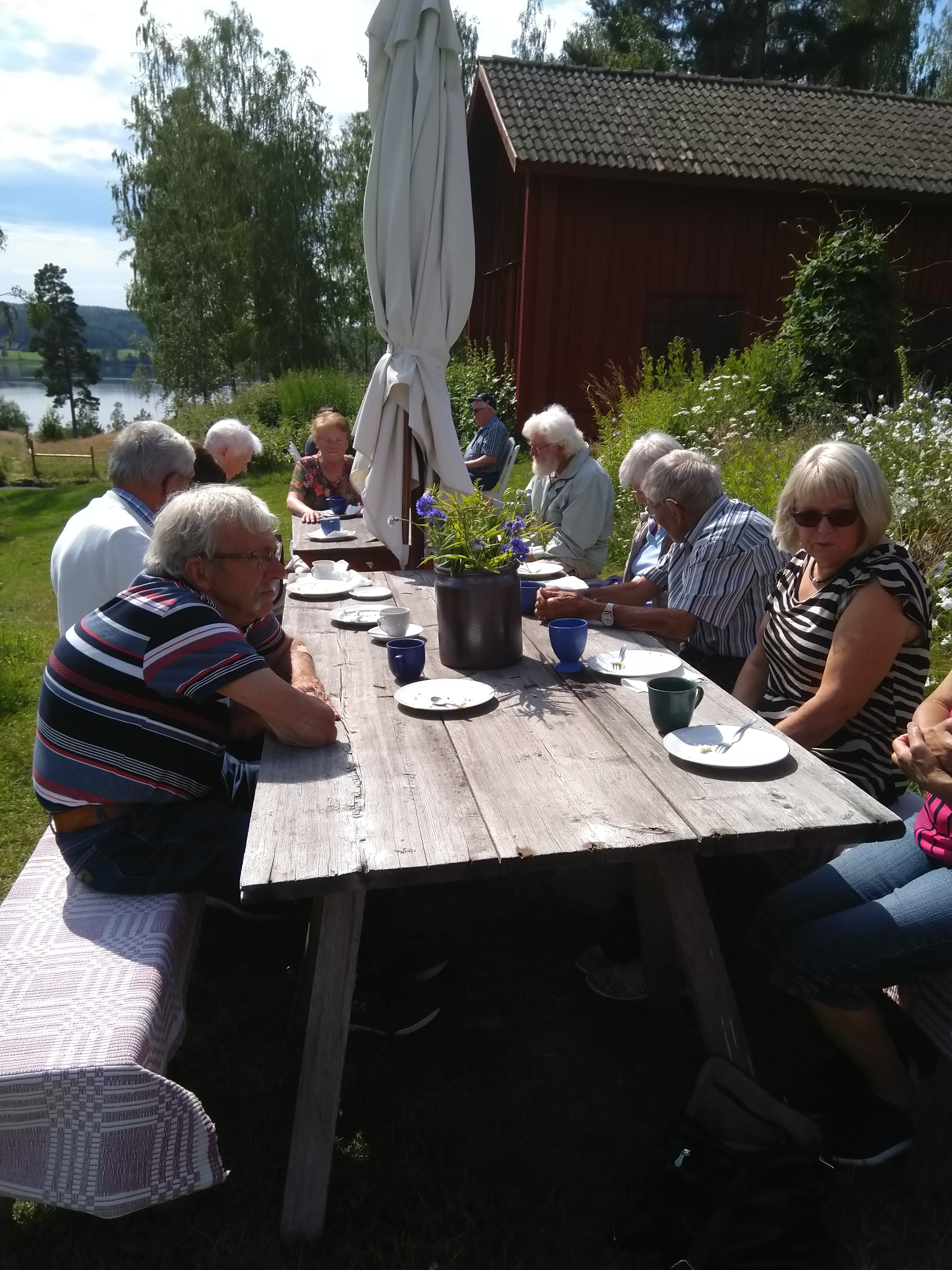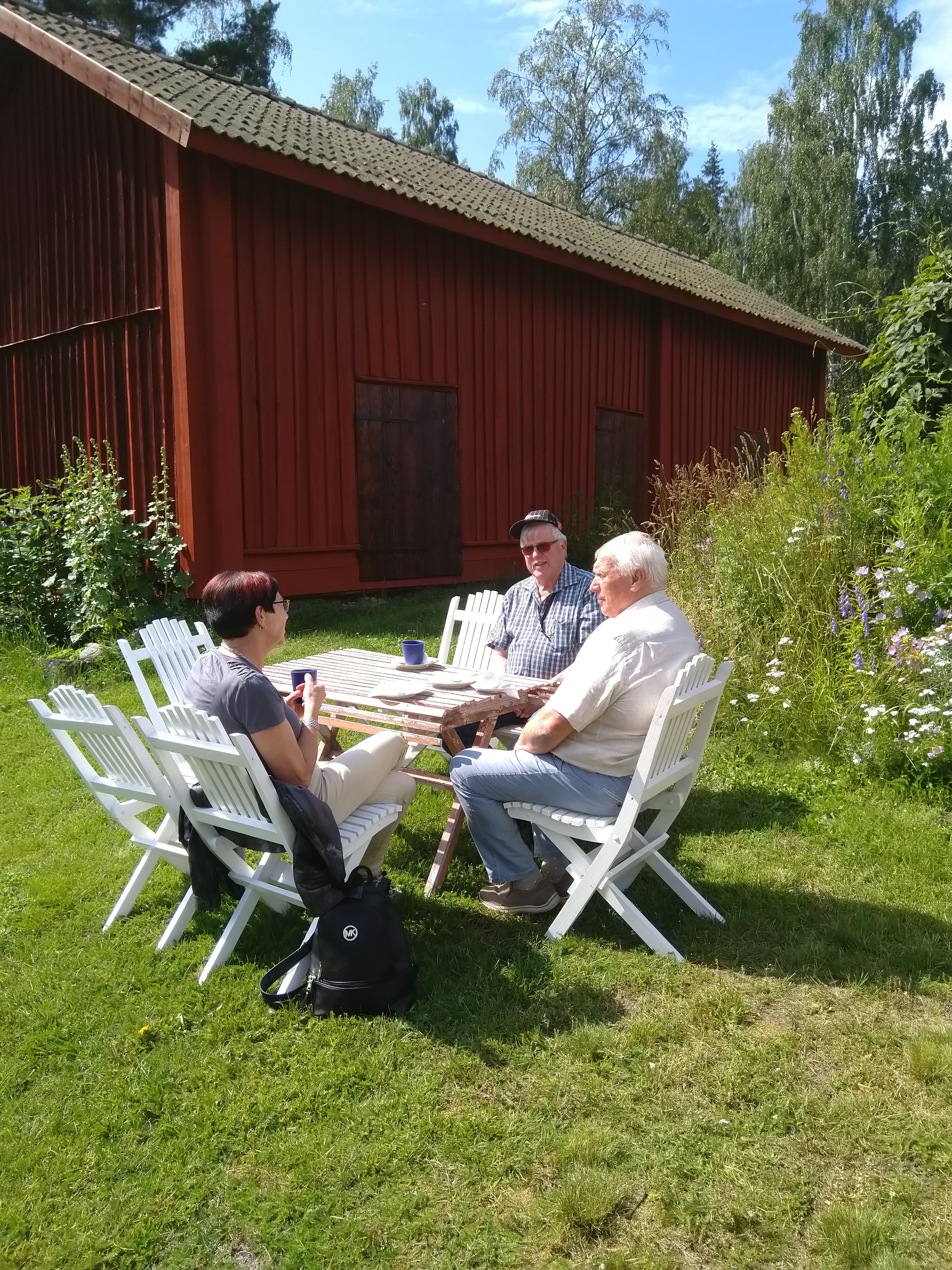 Fruktodlingen – GenbankenBernt Larsson och Håkan Ahlgren pratar om fruktsorterna.Här står vi på bryggan och tittar över till fastlandet, vi ser Nora kyrka.Vi åker över till fastlandet med båten ”Plaskus”Vi fortsatte våran resa med bil mot Nora Annas Café.Här sitter några av oss och fikar….… och här är nästa gäng….…. och här är sista gänget.
