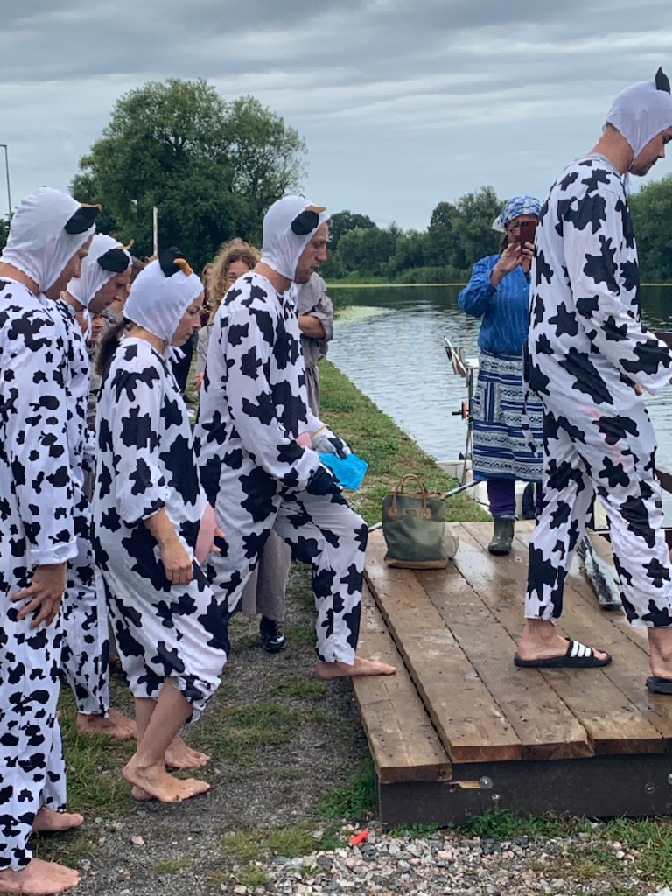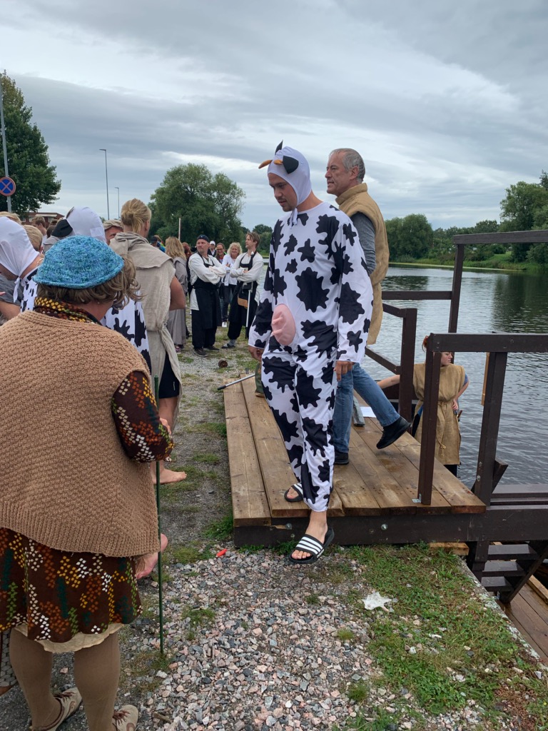 -Vi trodde det skulle lugna dem och få dem att känna sig som hemma så att de inte skulle springa runt i publiken som kalvar på grönbete. Men sjuttsingen heller, i stället blev de nervösa som sjutton och uppträdde som vid ett bättre kosläpp. De trodde att de hade missat kvällsmjölkningen så de tappade både fattning, åror och styrfart. Någon elak uschling sa att vårt lag helt enkelt hade drabbats av galna kosjukan. Men det förstår ju alla att det bara är ont förtal. Man kan nästan säga, att med det uttalandet om våra fina kossor, blev de närmast utsatta för rasförtryck och rasdiskriminering. Vi tänkte kräva en ursäkt från den i övriga fall synnerligen duktiga, vakna, kompetenta, artiga och väldigt trevliga tävlingsledningen. De kan sannolikt räkna med att vi ställer upp även nästa år i denna stora och väl ansedda kapprodd i Arboga.