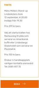 Börja gärna kvällen hos någon av våra samarbetande restauranger, Krydda eller Lindesbergs Stadshotell där en buffé står uppdukad från kl 16.00. Dryck tillkommer. Måns Möllers föreställning börjar kl 20.00 i Lindeskolans Aula. Insläpp från kl 19.30.