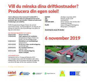 Framtidens Solel är ett projekt som ger inspiration och tips på hur du kan använda solel för att stärka ditt företag. Projektet finansieras av EU’s regionalfond och drivs genom olika aktörer i Västmanland, Örebro, Uppsala, Södermanland och Östergötland.
