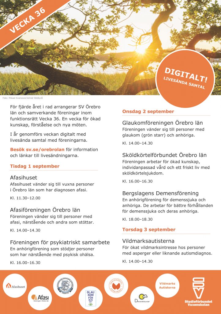 Vecka 36 – livesända samtal med föreningar inom funktionsrätt 28 augusti, 2020 Elias ben Salem Nyheter Kommentarer inaktiverade för Vecka 36 – livesända samtal med föreningar inom funktionsrätt Mer information på Studieförbundet Vuxenskolan