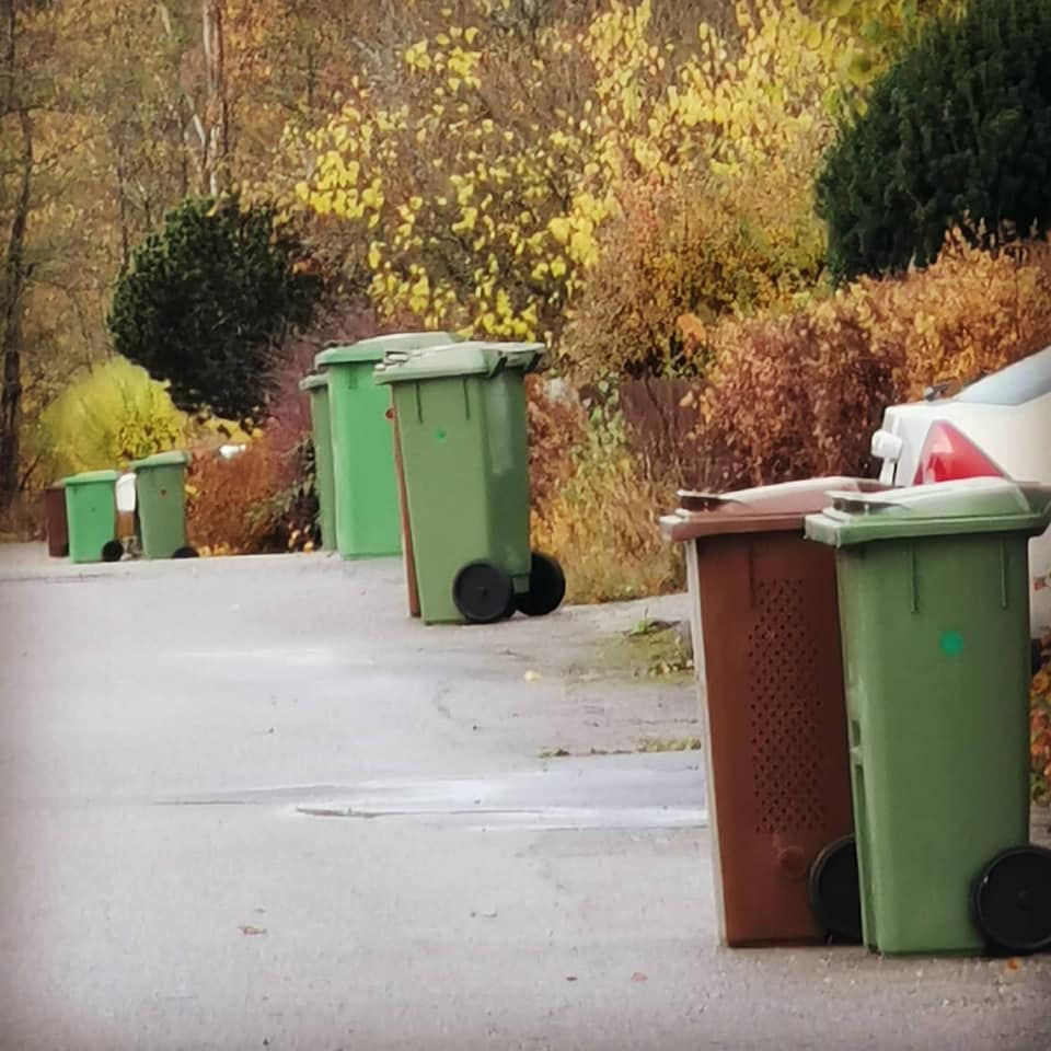 Soptunnorna på rad… Jag hade glömt att ställa ut soptunnan på kvällen, så jag rusade ut på morgonen i bara nattsärken när jag hörde sopbilen på intågande. När jag sen gick ut på min morgontur fick jag se hur tunnorna stod vackert på rad