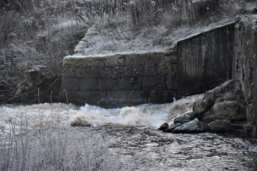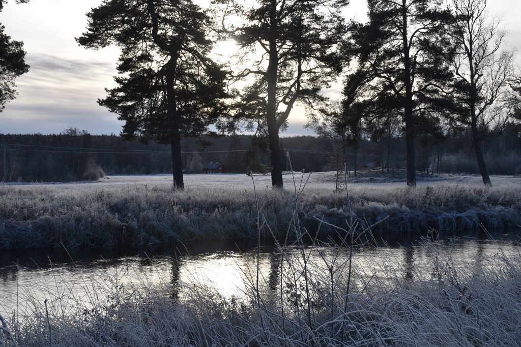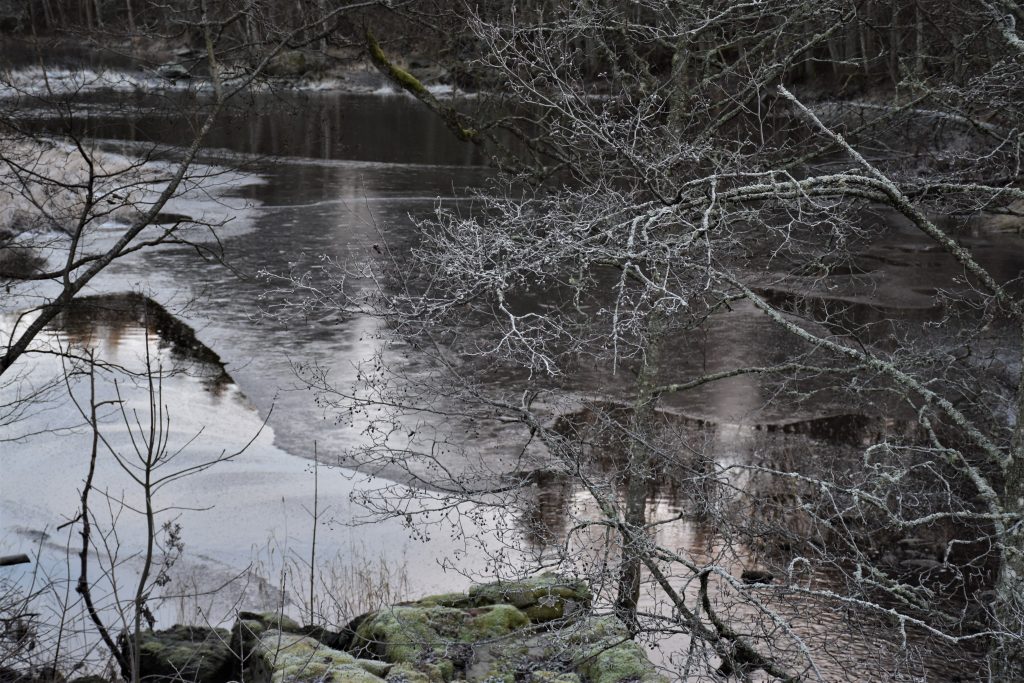 Lagom till Första Advent kommer så kylan och håller i sig även under dagen så frosten blir kvar. Vackert är det, men tämligen råkallt. Ljudet av att trampa i frusna löv är speciellt och ett minne som hänger kvar. Intill vattenflödet i dammen har det redan blivit några istappar.