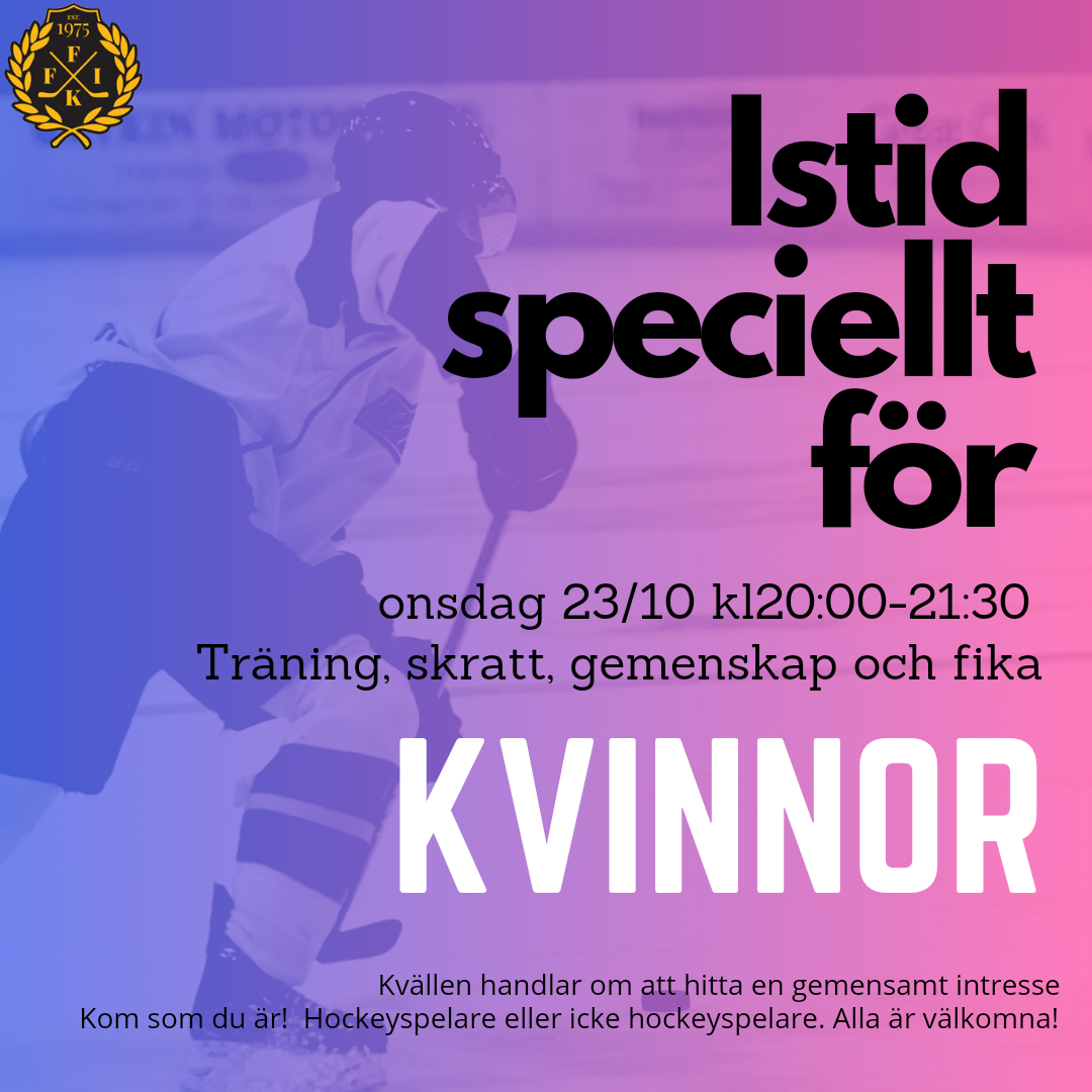 Ja, varför inte passa på att inleda ett nytt intresse när höstmörkret sänker sig över nejden. Som till exempel att fara runt på isen, vara isprinsessa eller hockeyspelare. Fast det är klart, när FFIK bjuder in till en speciell kväll för kvinnor på is, då handlar det mycket om skratt, gemenskap och fika. Så kom till ishallen i kväll kl. 20:00 och träffa andra kvinnor och kanske träna lite isåkande och hitta ett nytt intresse. Det spelar ingen roll om man är hockeyspelare eller inte; det är bara att komma som man är. Alla är välkomna!