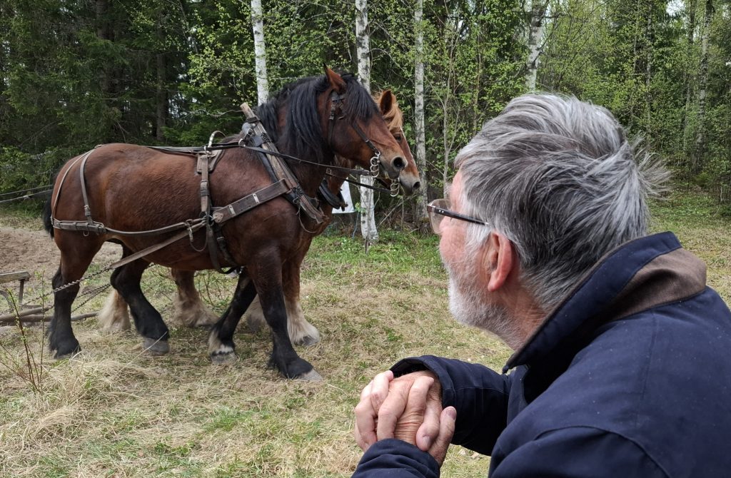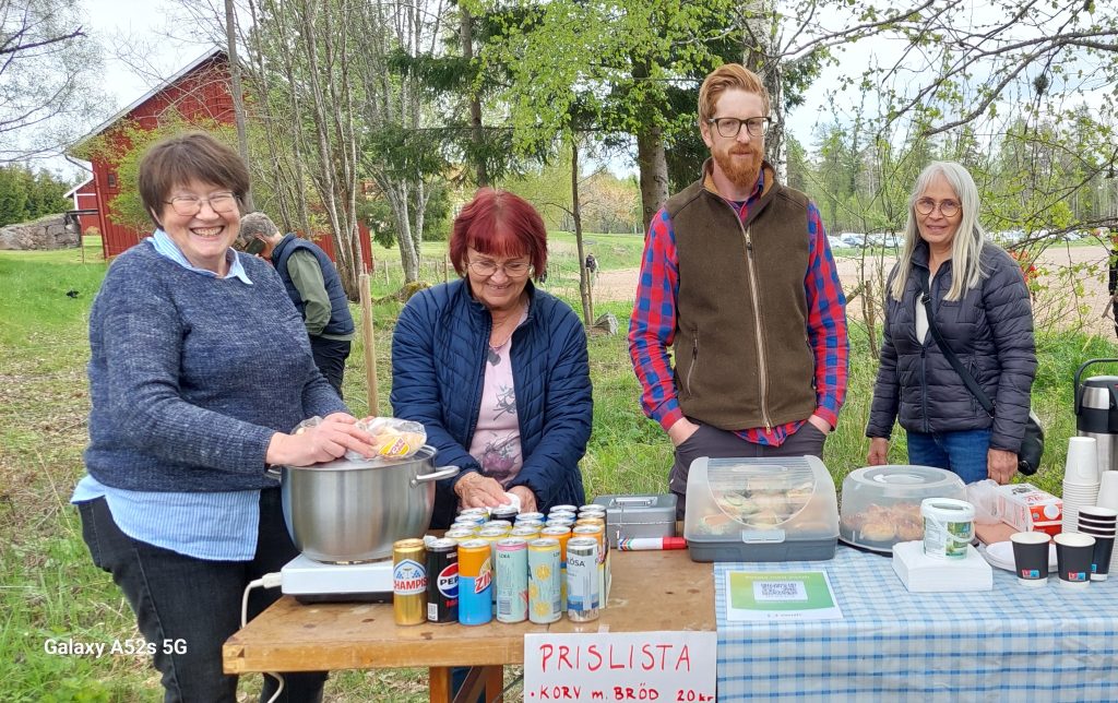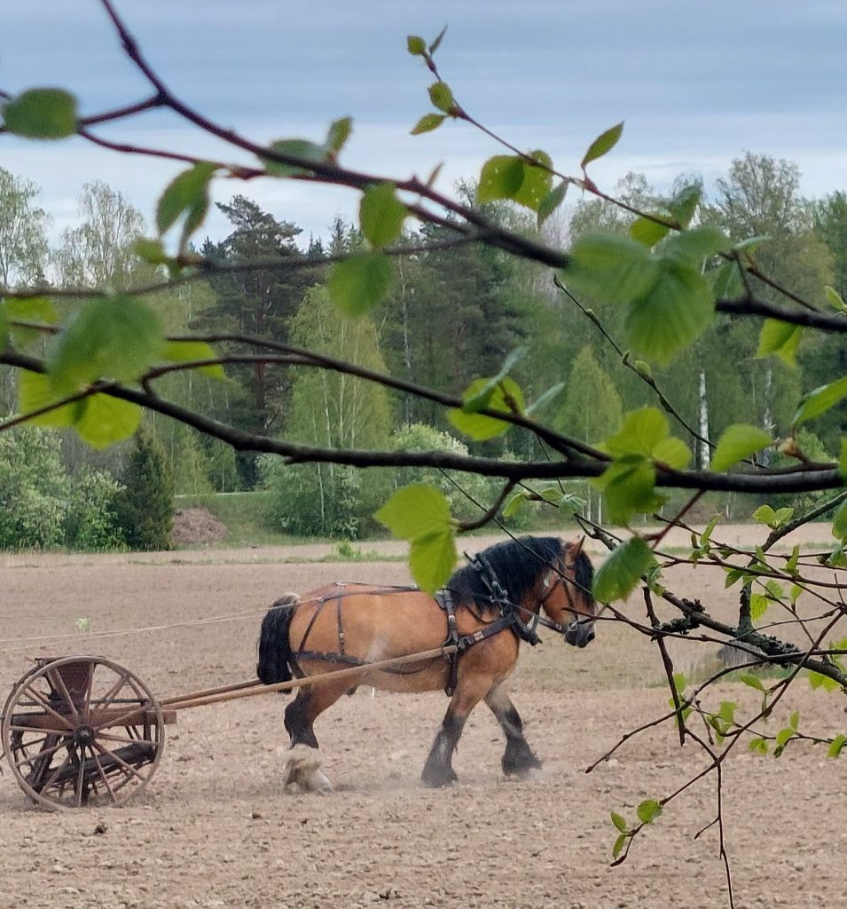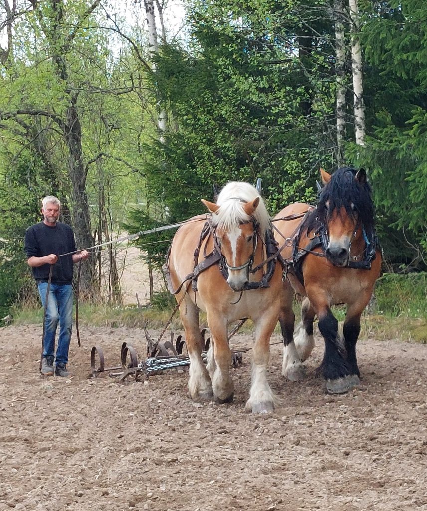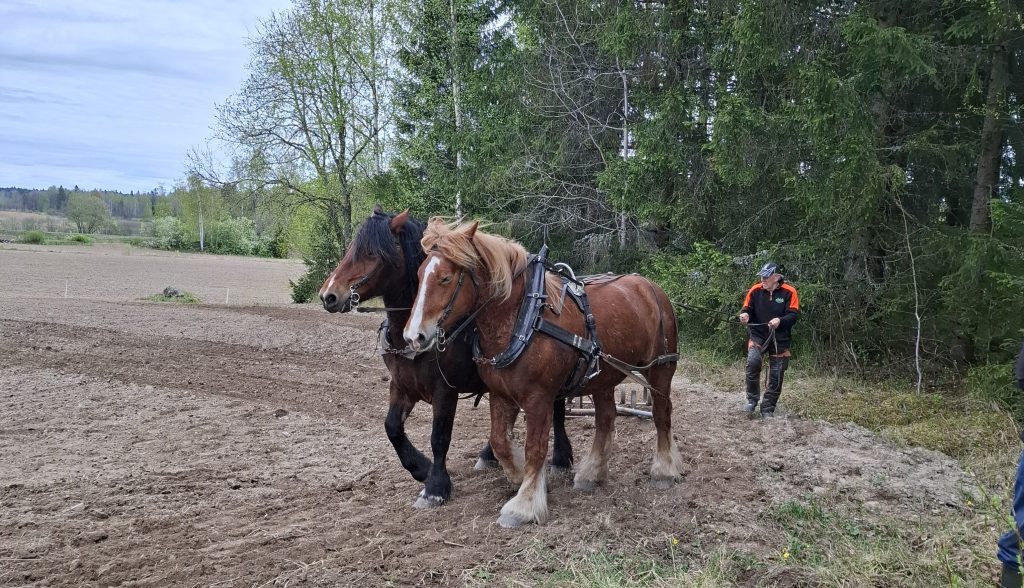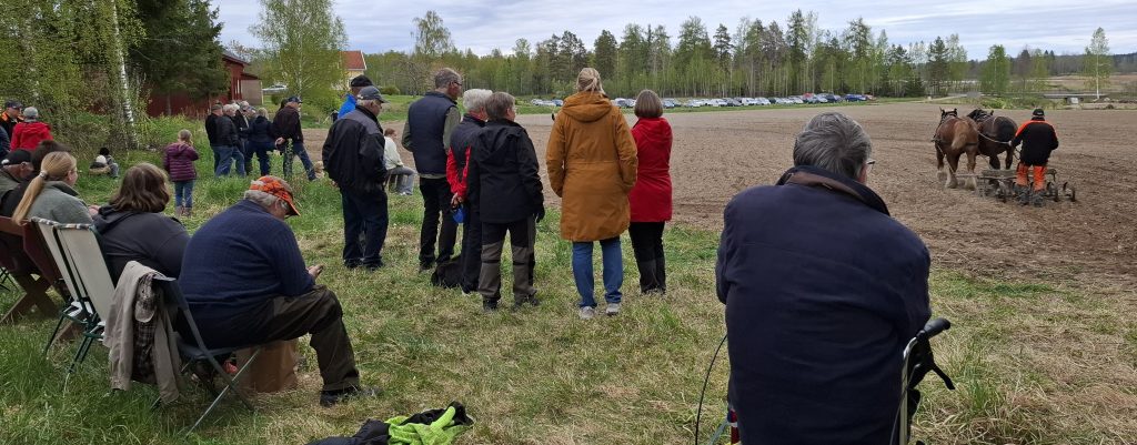 Parkeringen var full med bilar och efter en promenad längs åkern kom vi fram till en trevlig plats i skogskanten där vi kunde följa harvning och sådd medan vi njöt av gott fika eller varmkorv, som Sveaborgs bygdegårdsförening serverade. De stora vackra djuren gick med en rogivande lunk medan harven gjorde fåror i den torra jorden, hästföraren styrde med stadig hand och tydliga kommandon som hästarna lydigt följde. Samspelet mellan de stora starka hästarna och den betydligt mindre människan till fots bakom harven är mäktigt att se.
