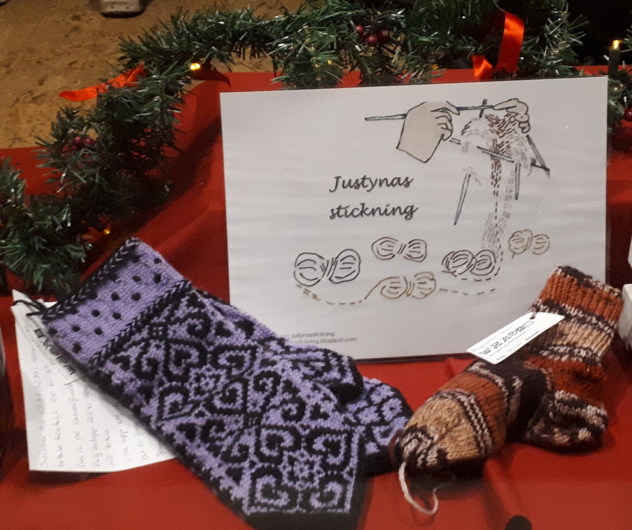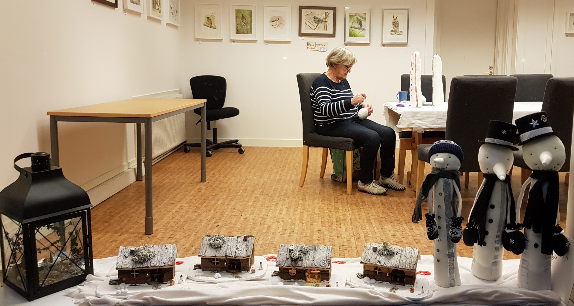 Genom skyltfönstret ser vi Birgitta Bartoft göra små snögubbar med pyttesmå vantar. De och de små husen är utmärkta presenter inför julen.