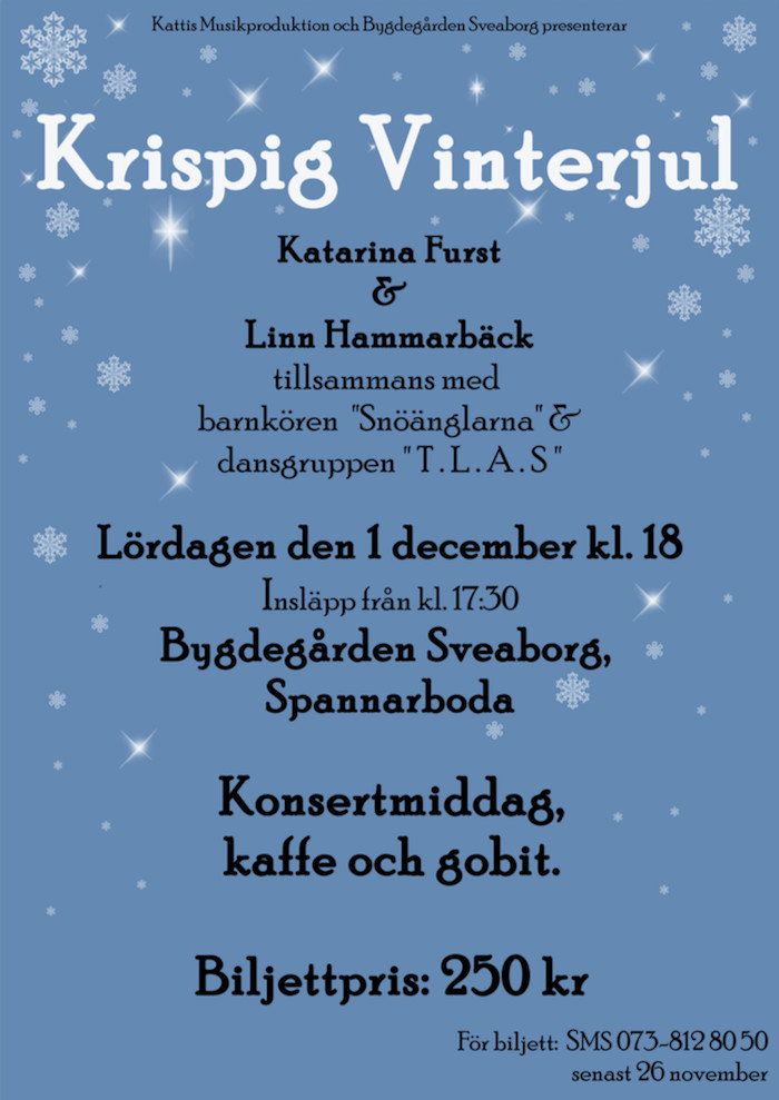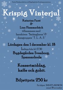 Lördag 1 december kl 18:00 (med insläpp från kl 17:30) bjuder Katarina Furst och Linn Hammarbäck tillsammans med barnkören Snöänglarna och dansgruppen T.L.A.S. på Krispig vinterjul i Spannarboda.