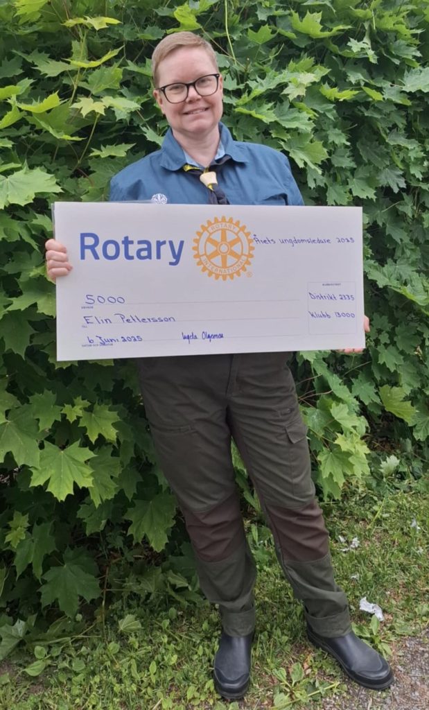 ”Rotary i Fellingsbro delar årligen ut ett stipendium på 5 000 kronor till någon som visat stort engagemang i ungdomsverksamhet i Fellingsbro. I år är det särskilt roligt att dela ut detta till en person som kommit tillbaka till hembygden och här engagerar sig i ungdomsverksamhet. Alla barn och ungdomar är inte intresserade av sport eller att sjunga i kör, därför känns det så roligt att det startats upp en scoutförening i samhället. Vi vill uppmärksamma detta och därför utsett Elin Pettersson till årets ungdomsledare.”