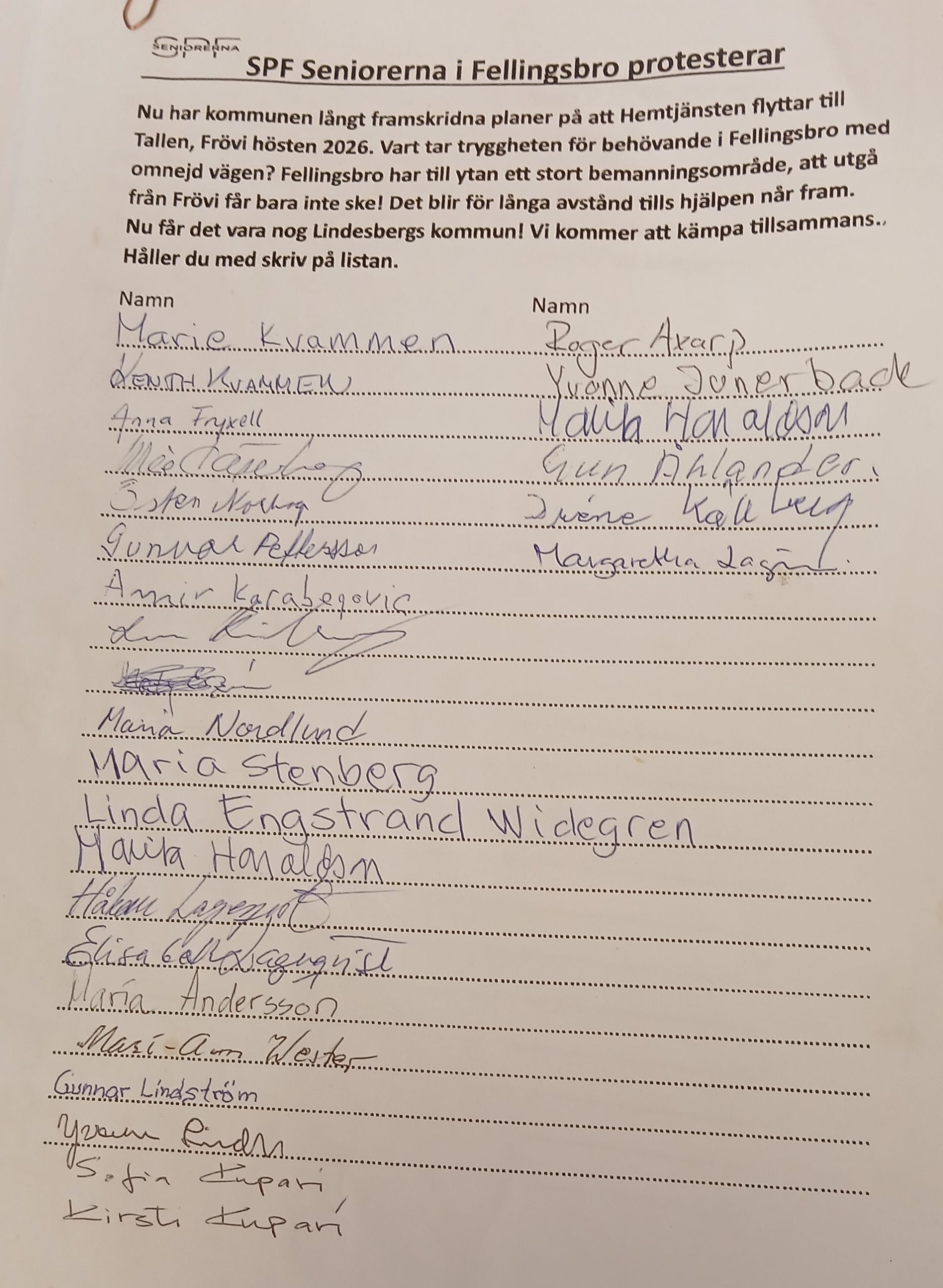 Kerstin Ahlgren berättar att verksamhetsadministratören Caroline Kleber ringde henne för ett par veckor sedan och bad om hjälp, varpå Kerstin satte sig och gjorde protestlistor. Totalt har man fått ihop över 1 000 namn genom att SPF Seniorerna har jobbat hårt med sina protestlistor. Det finns även två listor i Frövi för där blir de också drabbade eftersom matsalen på Tallen försvinner. Tydligen är det tänkt att hemtjänsten ska vara där trots att det är det enda stället som finns att samlas på för pensionärerna i Frövi. Nu har de ingenstans att vara eftersom allt är uppsagt på grund av ombyggnad.